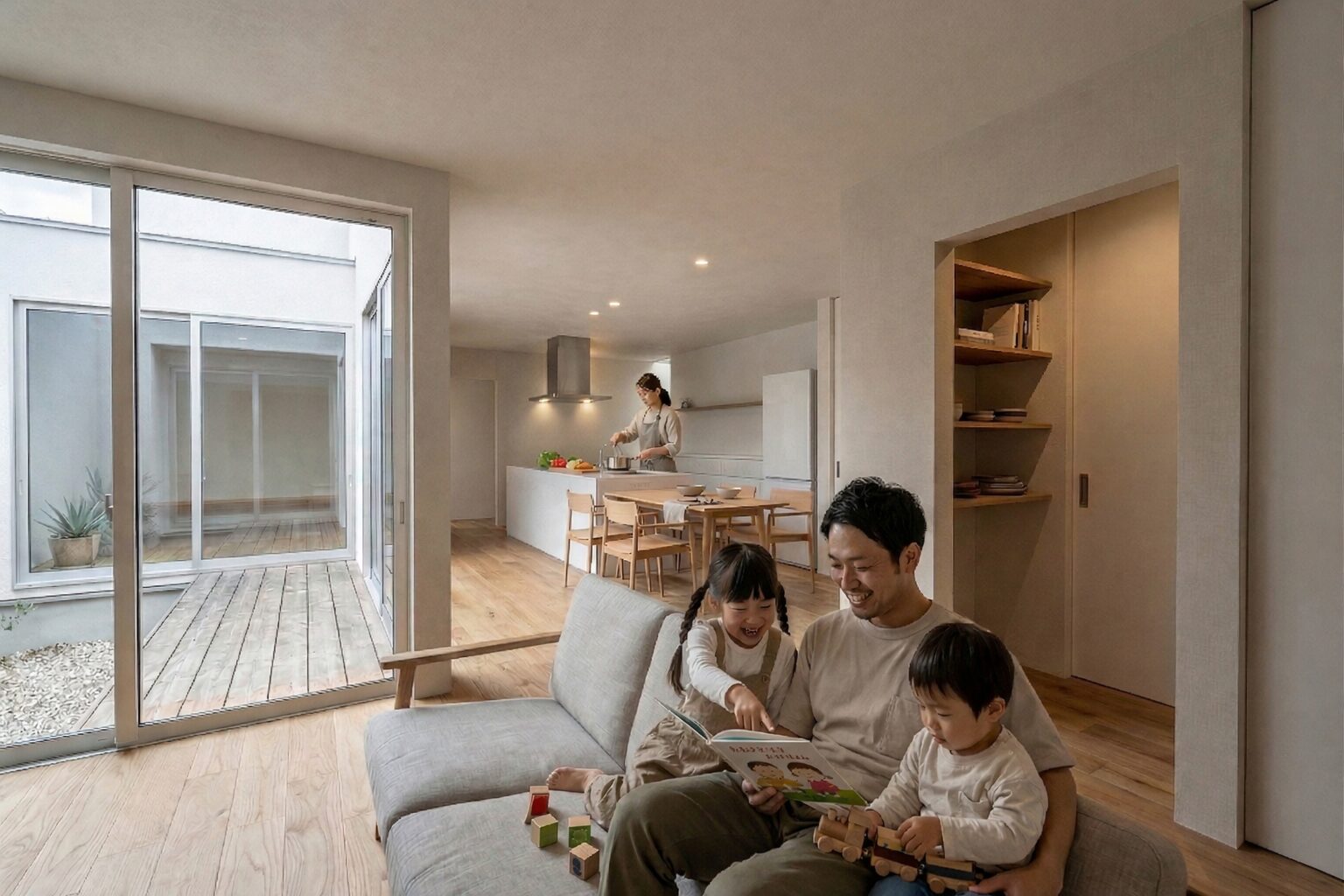 扉を開けた瞬間、吹き抜けの光とシンボルツリーが迎える開放的な空間。ここは、ただ間取りを決める場所ではなく、これからの暮らしを思い描く出発点です。無垢の床やヴィンテージの建具にふれながら、素材と光の質感をゆっくり感じていただけます。キッズルームやファミリーレストルームも備え、小さなお子さま連れでも安心です。