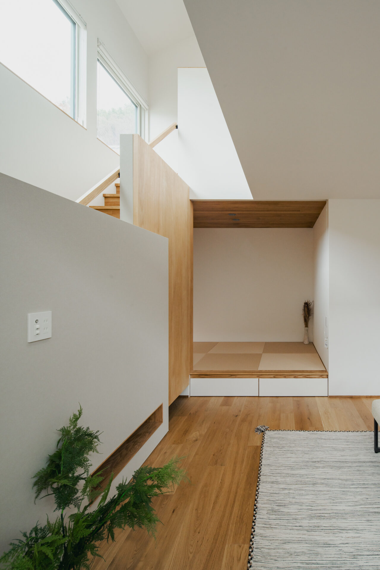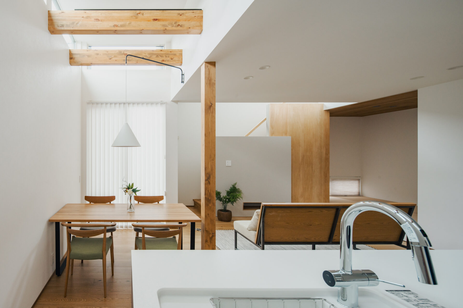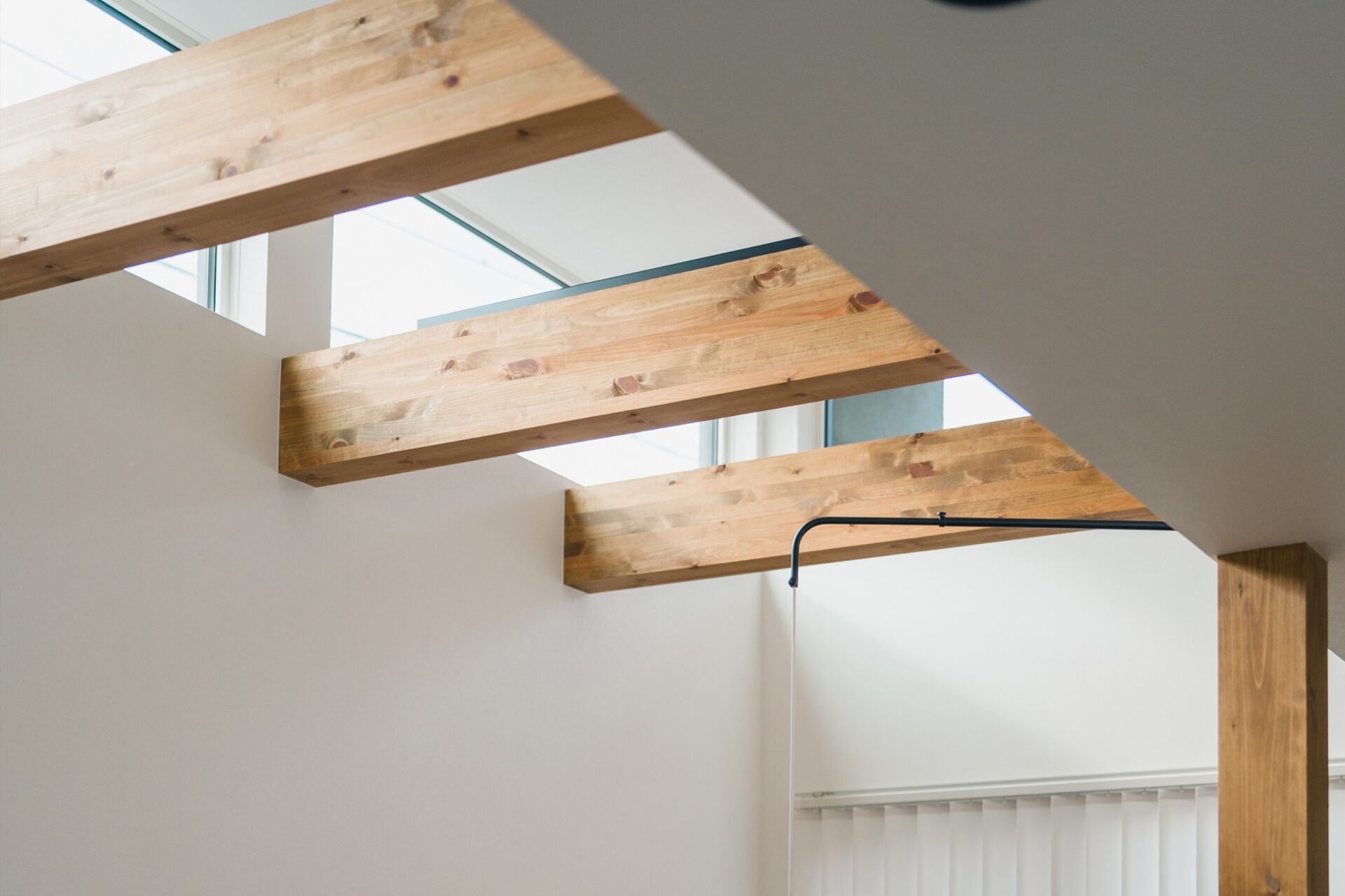 限られた敷地条件の中で室内に明るさと広がりをもたせるため、ハイサイドライトと吹き抜けを組み合わせ、空へと抜ける視線と光の広がりを感じる空間をつくった。