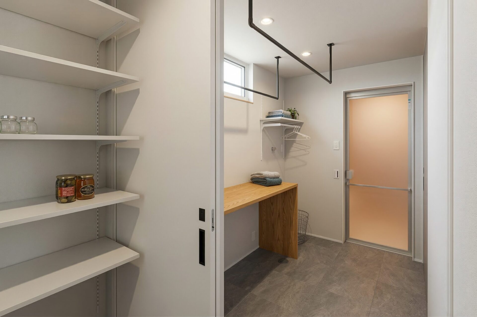 脱衣室とランドリーを一体化した水まわりは、家事の流れが自然につながる計画に。LDKは家族が自然と集まる空間とし、キッチンからリビングやダイニングを見渡せる配置とした。