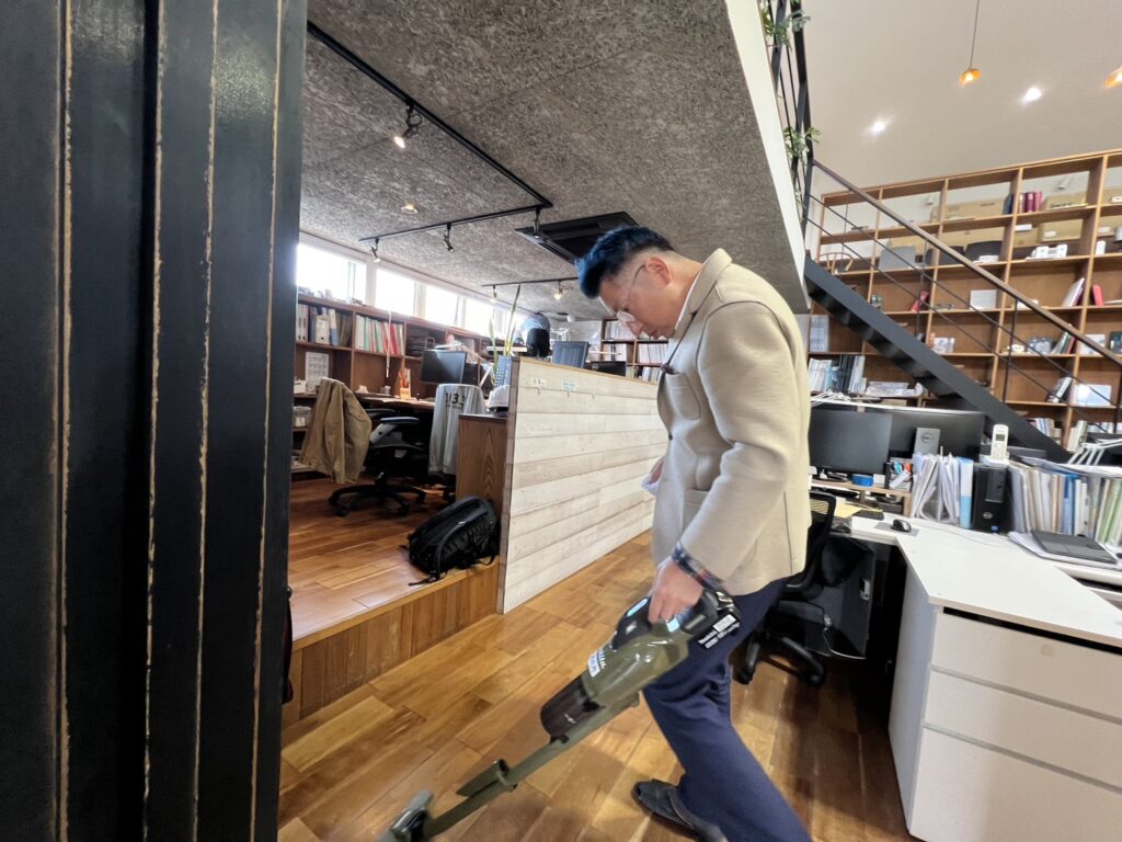 安田社長も青い髪で掃除頑張ってます。