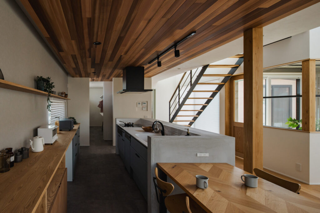 キッチンは間接照明と板張りで仕上げ、落ち着いた質感をまとった空間に。