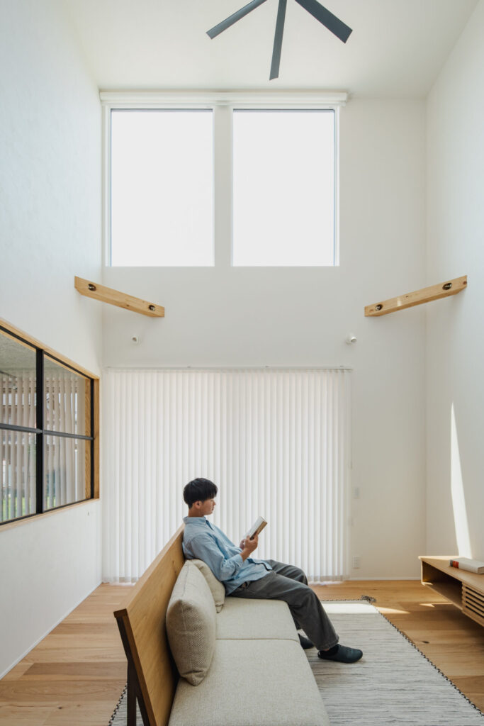吹抜けの大開口からは光が降り注ぎ、リビングに明るさと開放感をもたらす。