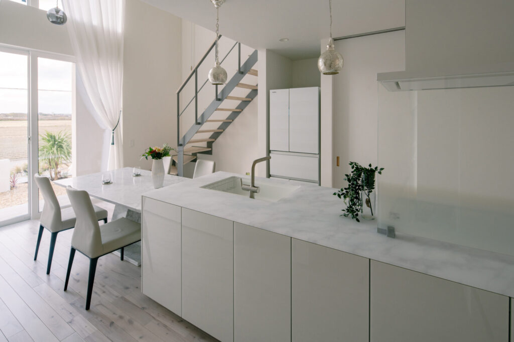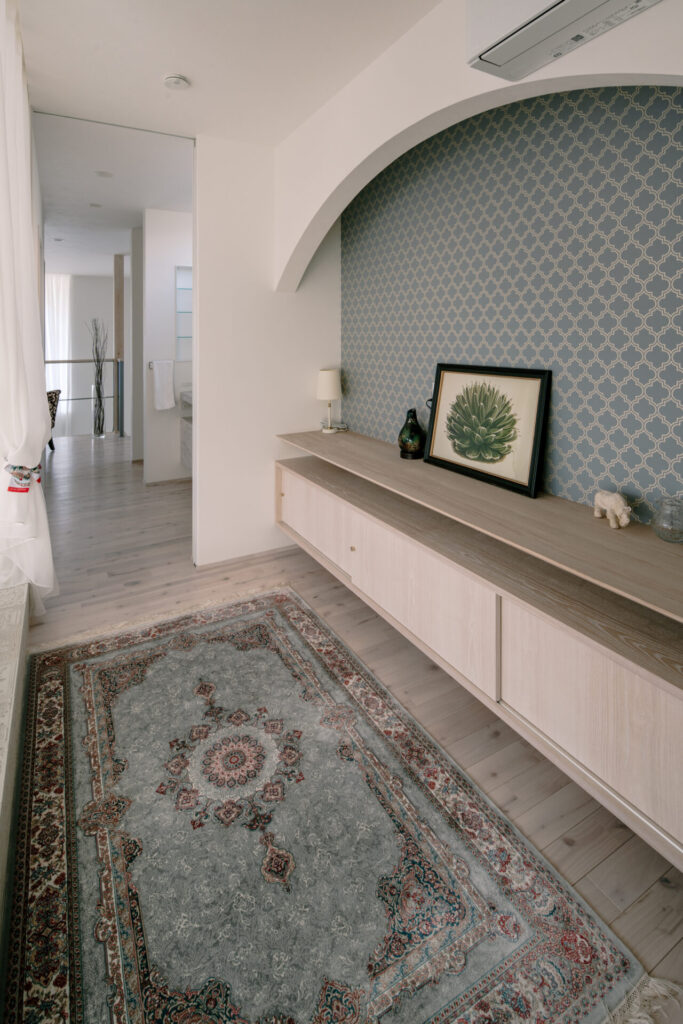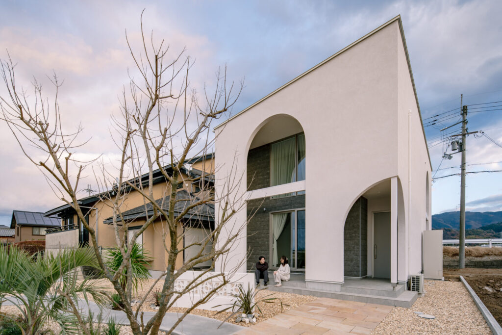 お気に入りの車が映えるよう、色や質感にこだわりつつ、ほんの少しのエスニックな要素をアクセントに。西に広がる田園風景と、沈む夕日を望むテラス。アーチの先に広がる景色が、室内と外とをやわらかくつなげる。あぐらをかいて寛げる大きなL字型の造作ソファ、シンボルツリーを望む浴室、静かな時間を楽しむ2階ホール。ご夫婦と愛犬が、それぞれの心地よさを見つけられるよう、シーンごとに丁寧に思いを巡らせた。