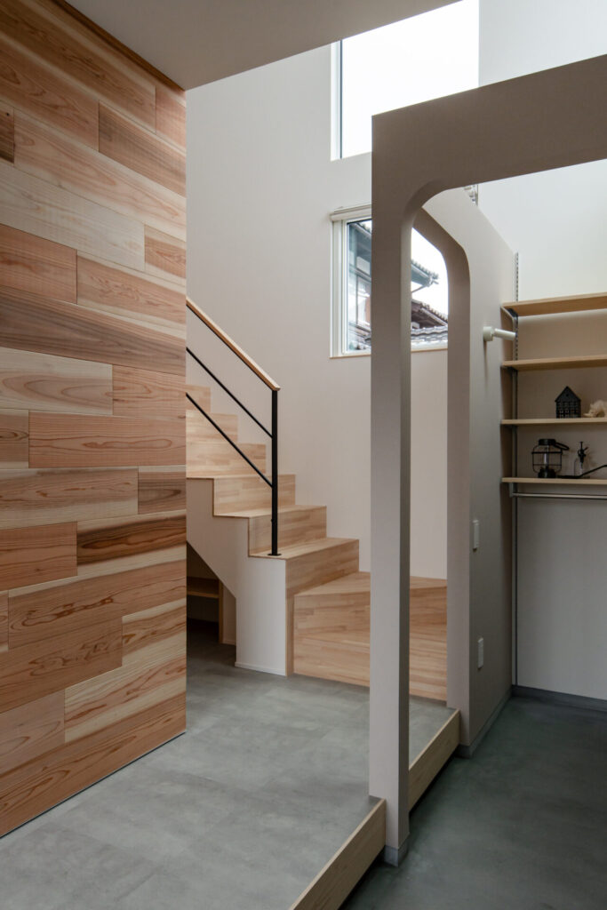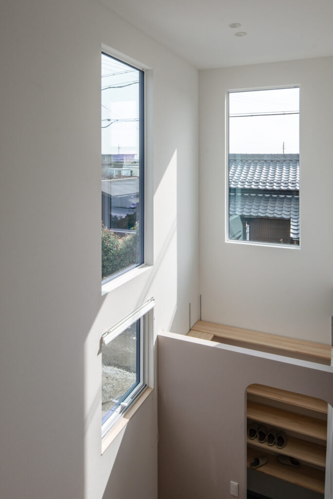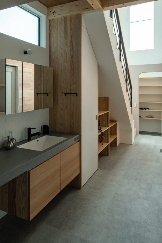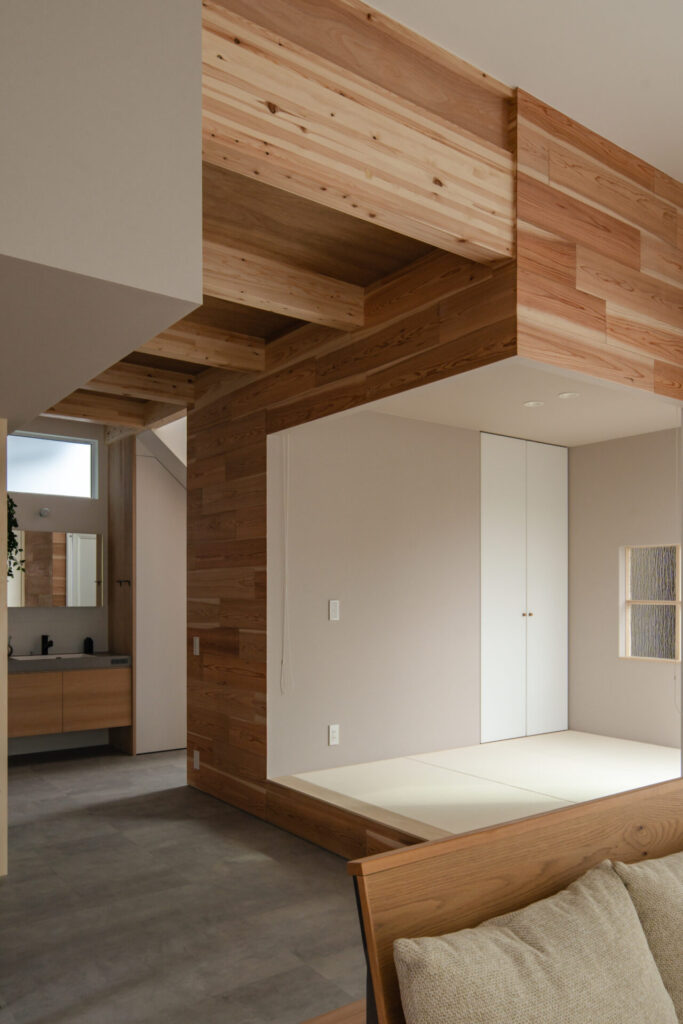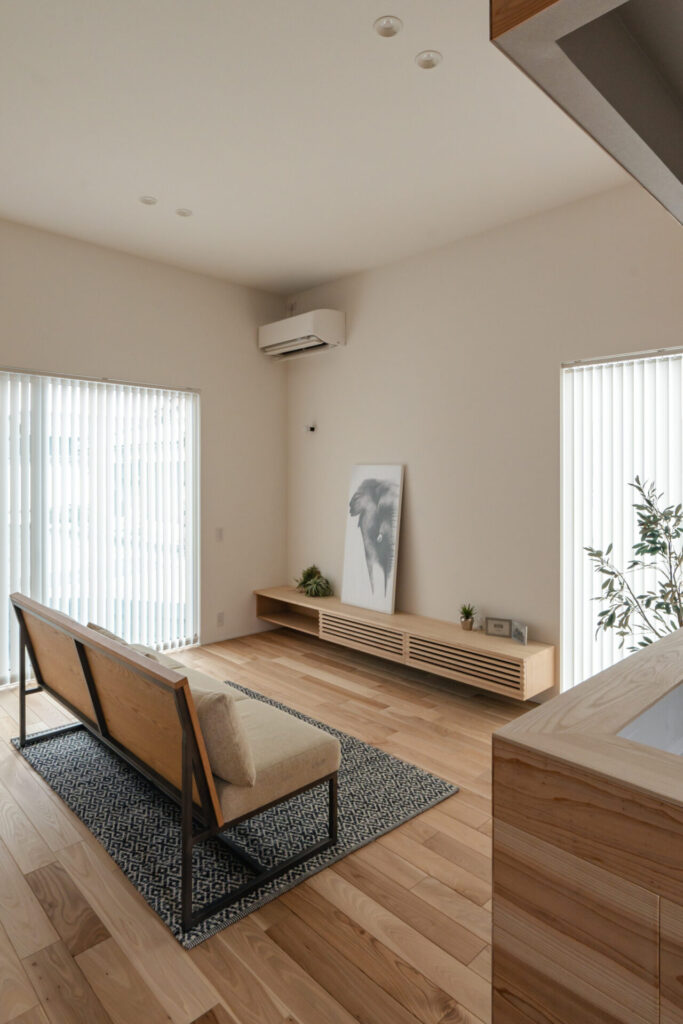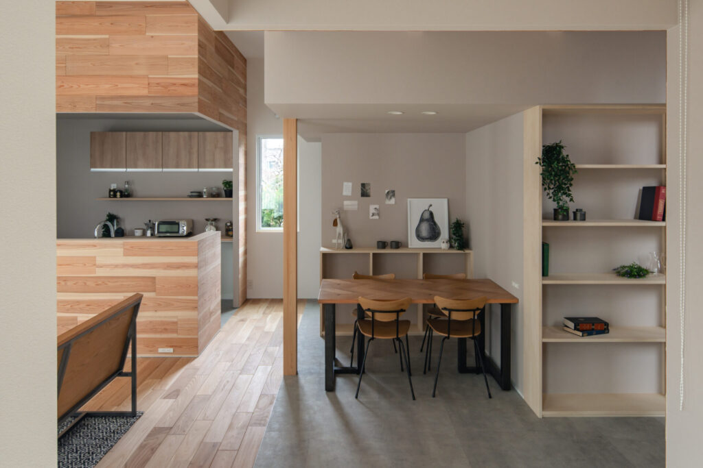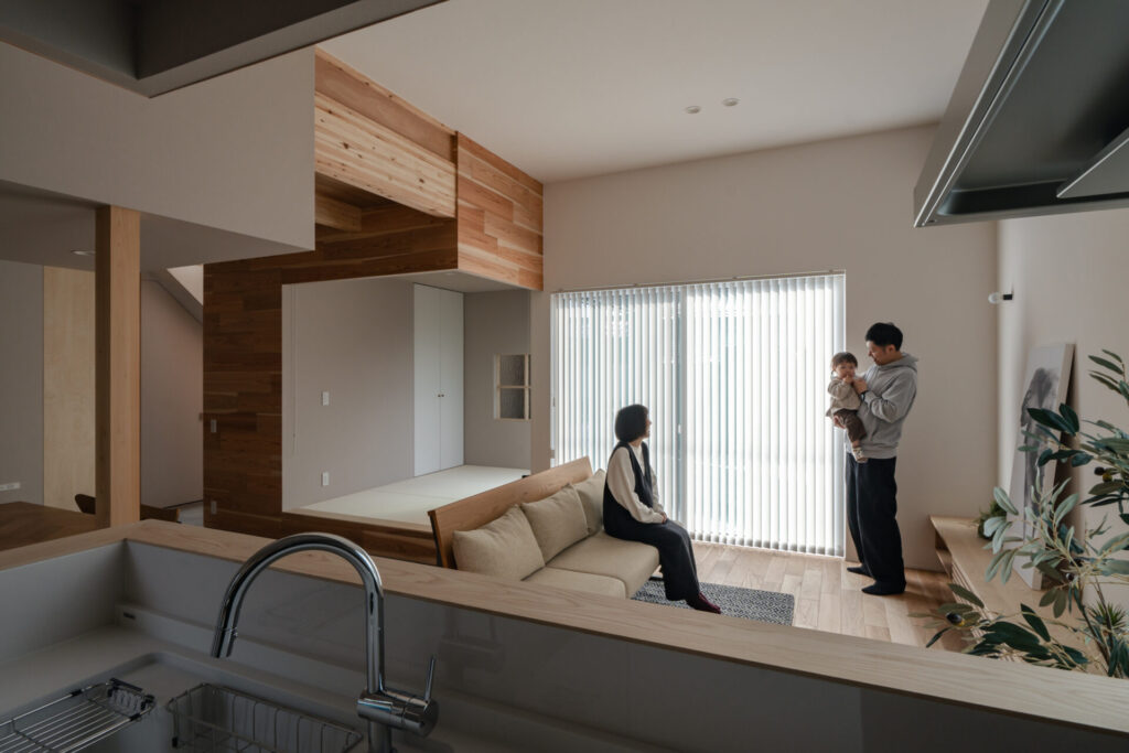 限られた空間に、どれだけの心地よさを詰め込めるか。その問いに向き合い、各部屋には自然光を取り込み、動線には軽やかな流れをもたせた。LDKは無垢材の質感を活かし、ボックス状にゾーニングすることで、ひと続きの空間に緩やかな表情を加えている。細かなご指定は少なかったが、そのぶん自由度が高く提案の幅も広がった。打合せもスムーズで、信頼関係の中でかたちになっていったこの家。引き渡し後に生まれたお子さまが、年月を重ねてふと振り返ったとき、「この家で育ってよかった」と思ってくれたなら、それ以上の喜びはない。