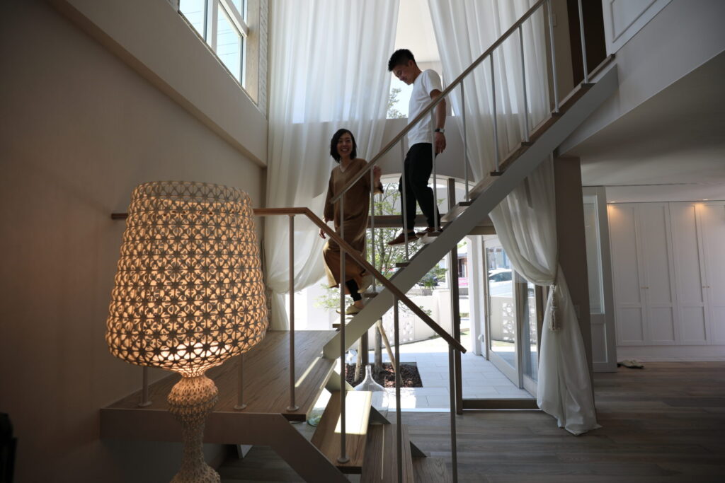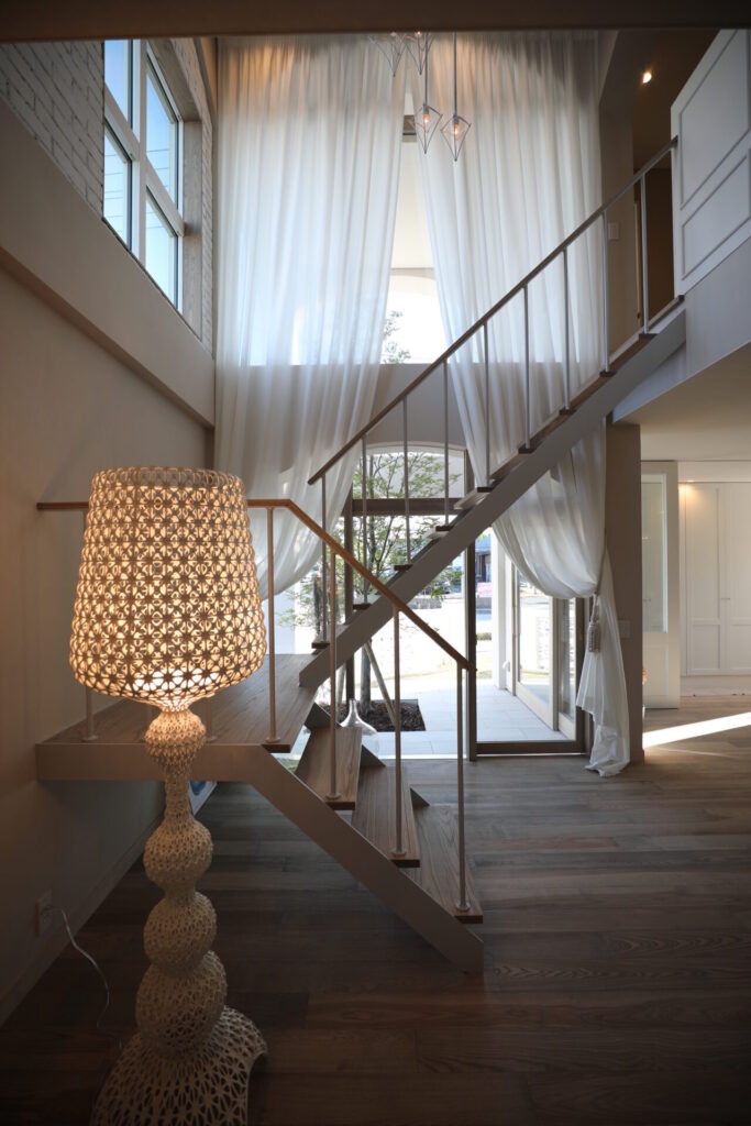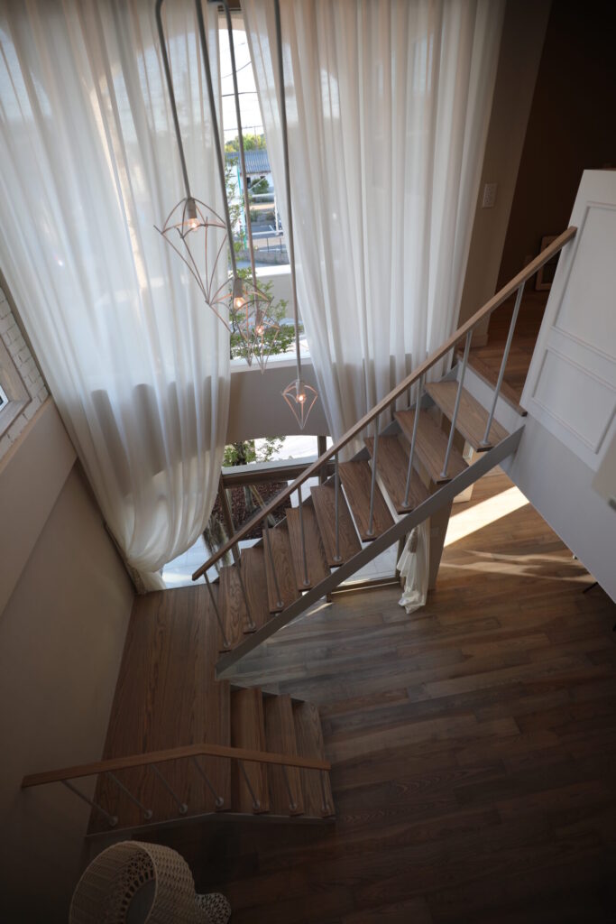 リビングから続く大きな吹抜け。吹抜けを通して中庭のグリーンが見えることで、家に居ながらリゾート気分を味わえます。ベージュの塗り壁とグレージュのアイアンの階段が統一感を持たせ、個性的な素材を採用したデザインが目を引きます。また、ひとつひとつ手作業で造られたブロック調の壁が印象的です。
