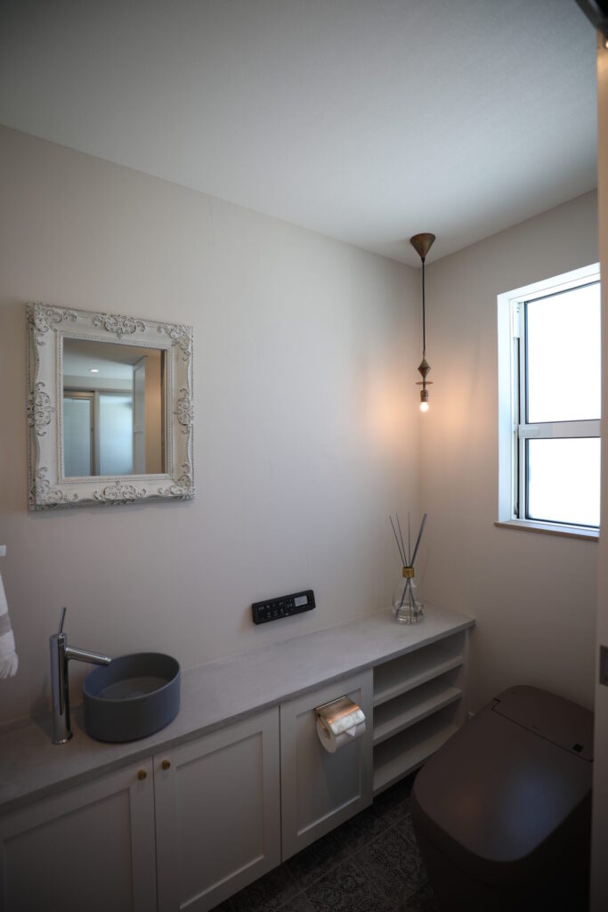 1階のトイレや洗面脱衣室には、エキゾチックなイスラム模様のタイルが敷き詰められています。洗面台やトイレのカウンターは造作で、白を基調にゴールドのツマミを統一。可愛らしさと品の良さが融合したデザインが特徴です。