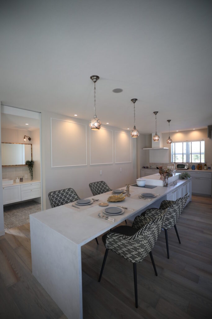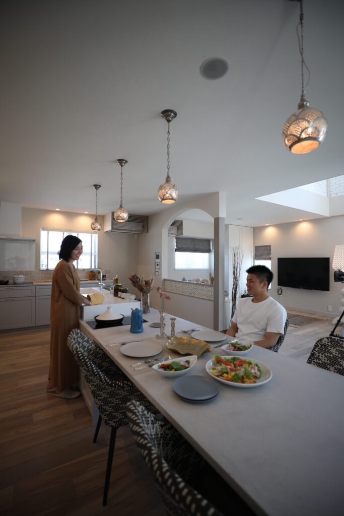 ダイニングテーブル一体型キッチンカウンターは、モールテックスで造作。カウンター部分は椅子とのバランスがちょうどいい高さに設定し、シンクや作業スペースは立ち仕事がしやすいように一段高くしています。また、ダイニングテーブルにビルトインされたIHクッキングヒーターもポイントです。光が透けて天井に模様を映し出すモロッコランプが空間を照らします。