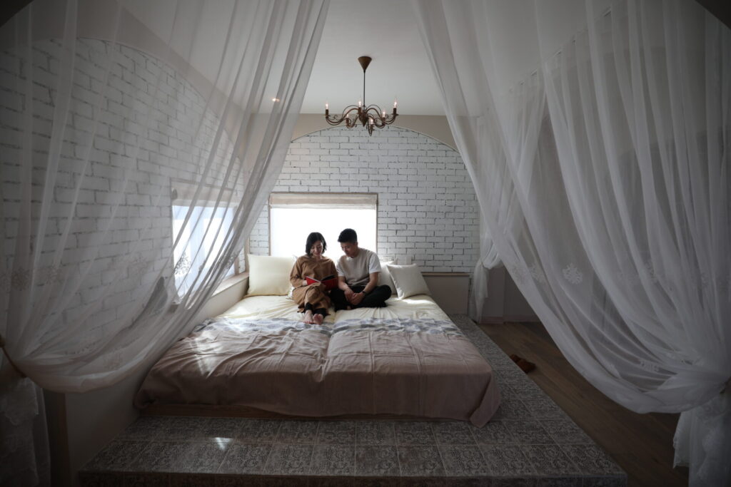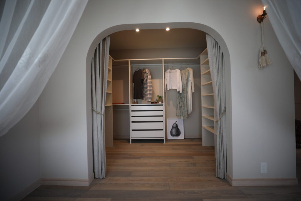 主寝室とセカンドリビングは仕切りなくつなげ、開放感のある空間を実現。主寝室の大きなベッドにはタイルをあしらい、デザイン性を高めています。この家のためだけに造られたオリジナルの照明器具も印象的。大型WICもひとつづきになっており、生活感を感じさせずにすっきりとした暮らしが実現できます。