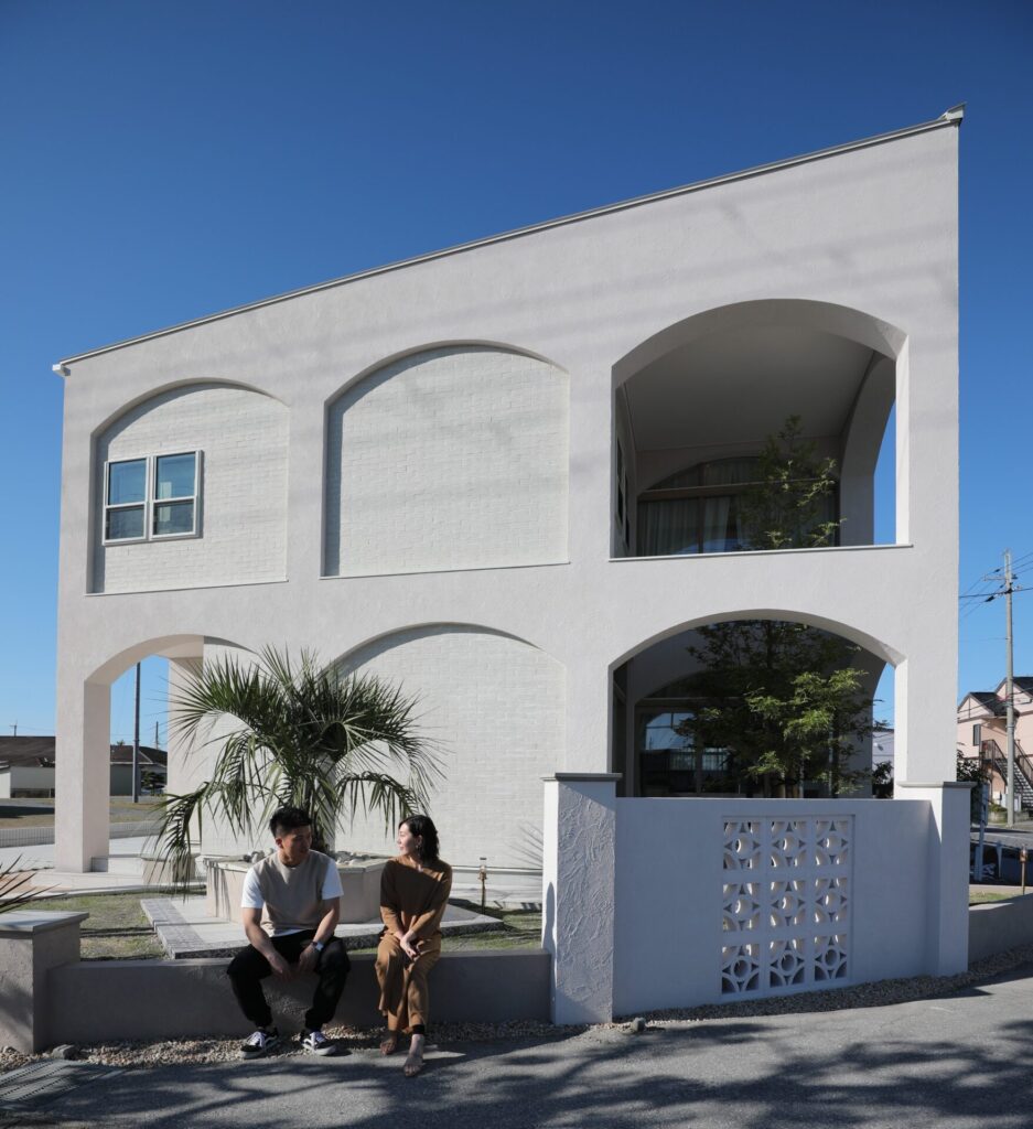 印象的なアーチを随所に取り入れた外観。すべてのアーチを同じ角度・幅に統一し、バランスの取れたデザインに仕上げています。外観を彩るのは、サボテンやシマトネリコの木など、バリエーション豊かな植栽。これらの緑は家の中からも楽しむことができ、異国情緒漂うリゾート気分を感じることができます。