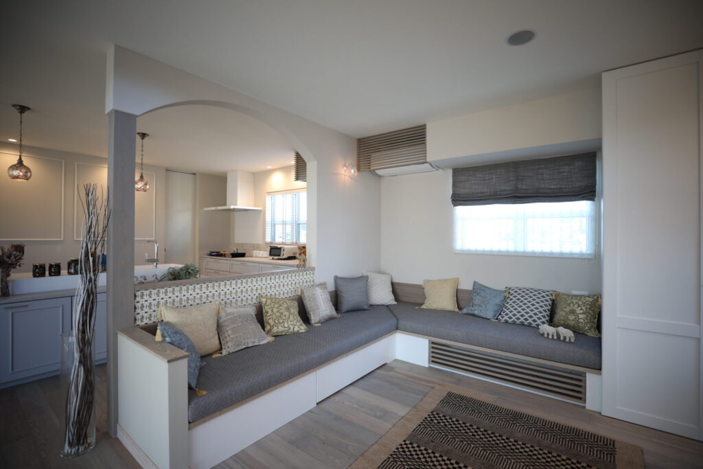 家族全員がゆったりと座れる大きなL字型ソファを配置したリビング。個人の部屋にこもらず、家族との時間を大事にするモロッコの暮らしをモチーフにしています。幾何学模様のブロックを使った仕切りなど、細部までこだわりました。